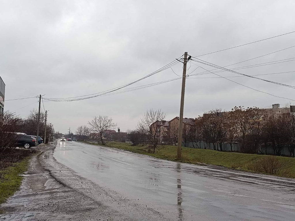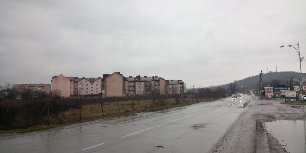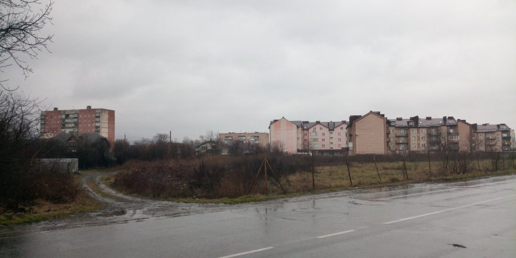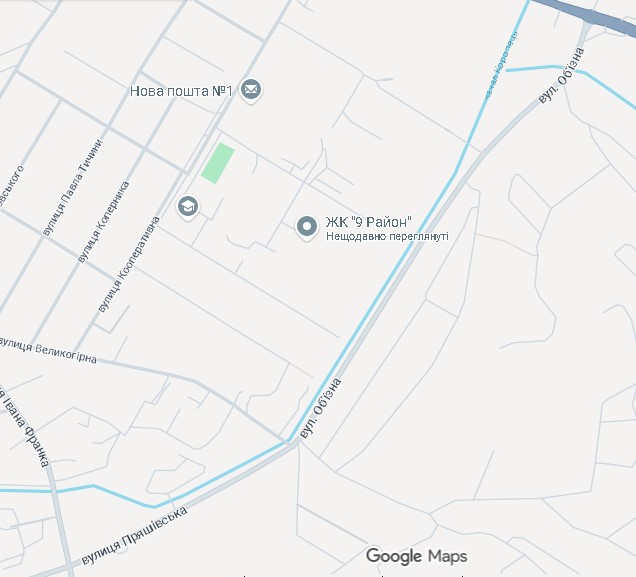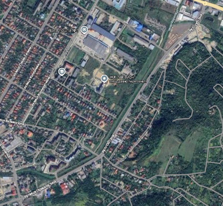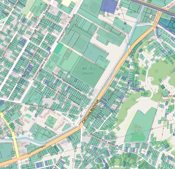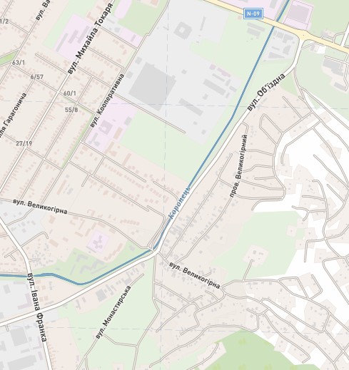 Також є розбіжності у протяжності вулиці. Починається вона однаково з кільця по вулиці Масарика, але Гугл і Візіком обрізають вулицю на перетині з Великогірною. А кадастр – на перетині з вулицею Івана Франка. Якщо уважно придивитися, то на кадастровій карті земельні ділянки між Великогірною і Франка зареєстровані саме на Об’їзДній. Так як кадастр є офіційним державним джерелом, то будемо дотримуватися цієї інформації. Також Об’їздна відділяє мікрорайон Сільхоз від дачного масиву під горами Павлова і Велика.